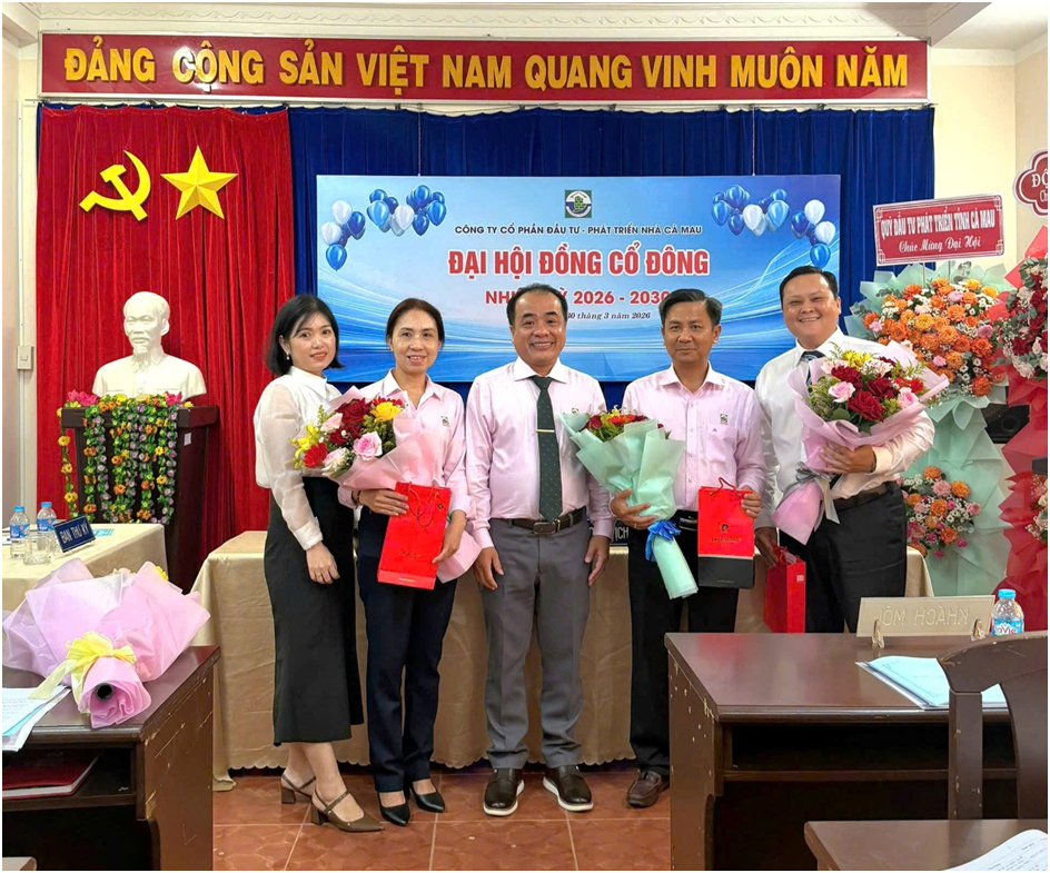 Đại hội đồng cổ đông Nhiệm kỳ 2026-2030 đã kết thúc thành công tốt đẹp. Với sự đồng thuận rất cao của cổ đông và quyết tâm của Hội đồng quản trị, Ban kiểm soát nhiệm kỳ 2026-2030, chắc chắn rằng Công ty cổ phần Đầu tư – Phát triển nhà Cà Mau sẽ không ngừng phát triển đóng góp tích cực vào sự nghiệp phát triển kinh tế tỉnh nhà.
