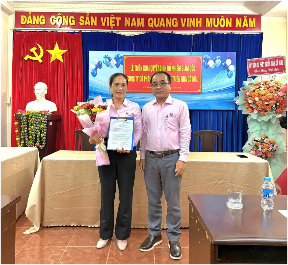 Ông Phan Hoàng Huynh, đại diện Hội đồng quản trị công bố Quyết định số 04/QĐ-HĐQT ngày 30/3/2026 của Chủ tịch Hội đồng quản trị về việc bổ nhiệm Giám đốc Công ty cổ phần Đầu tư – Phát triển nhà Cà Mau. Theo đó, bổ nhiệm bà Tô Hồng Ngọc Giám đốc Công ty, giữ chức vụ Giám đốc Công ty cổ phần Đầu tư – Phát triển nhà Cà Mau, thời gian bổ nhiệm 5 năm kể từ ngày ký Quyết định.