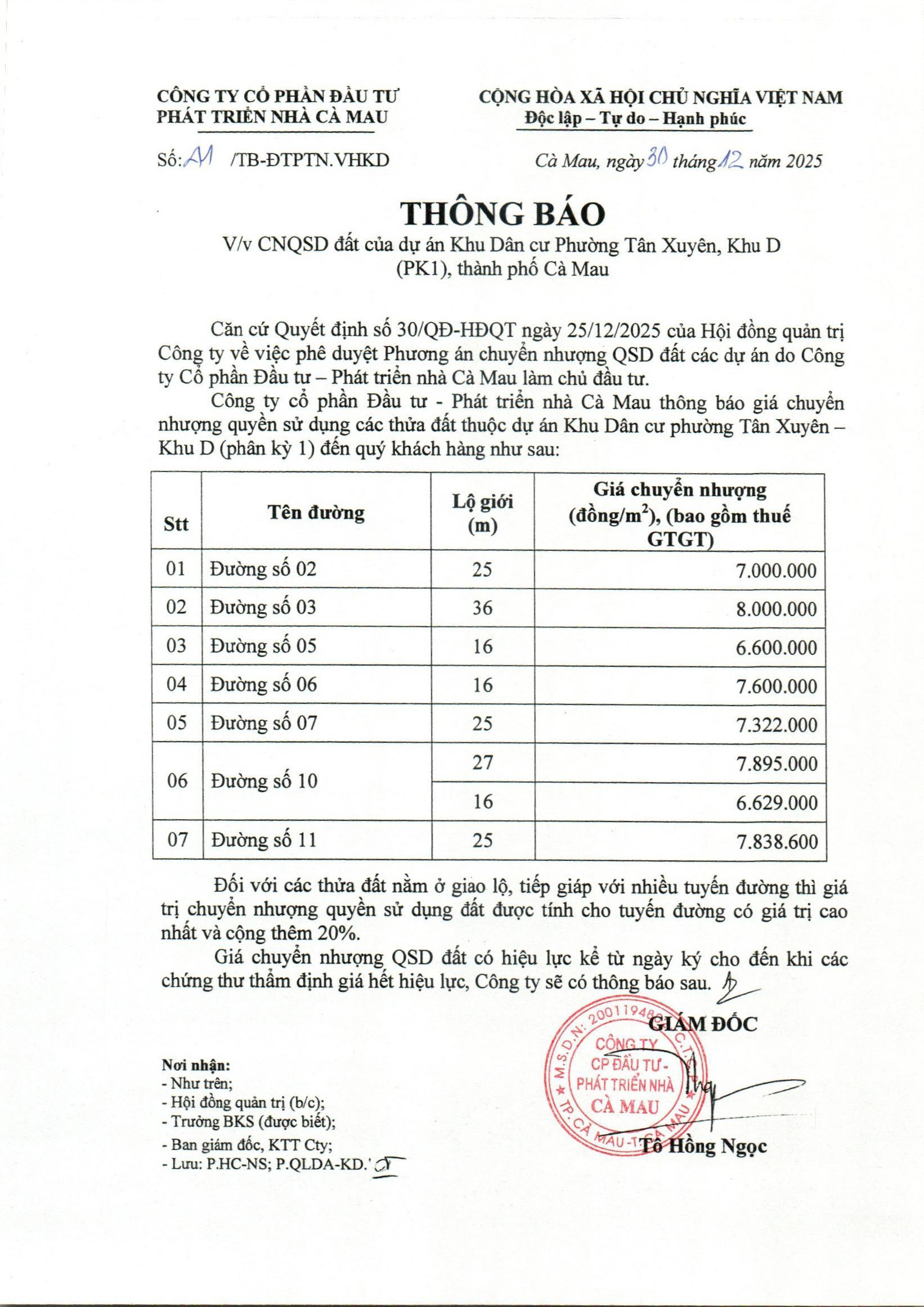 Chuyển quyền sử dụng đất của Dự án Khu dân cư phường Tân xuyên, khu D phân kỳ I