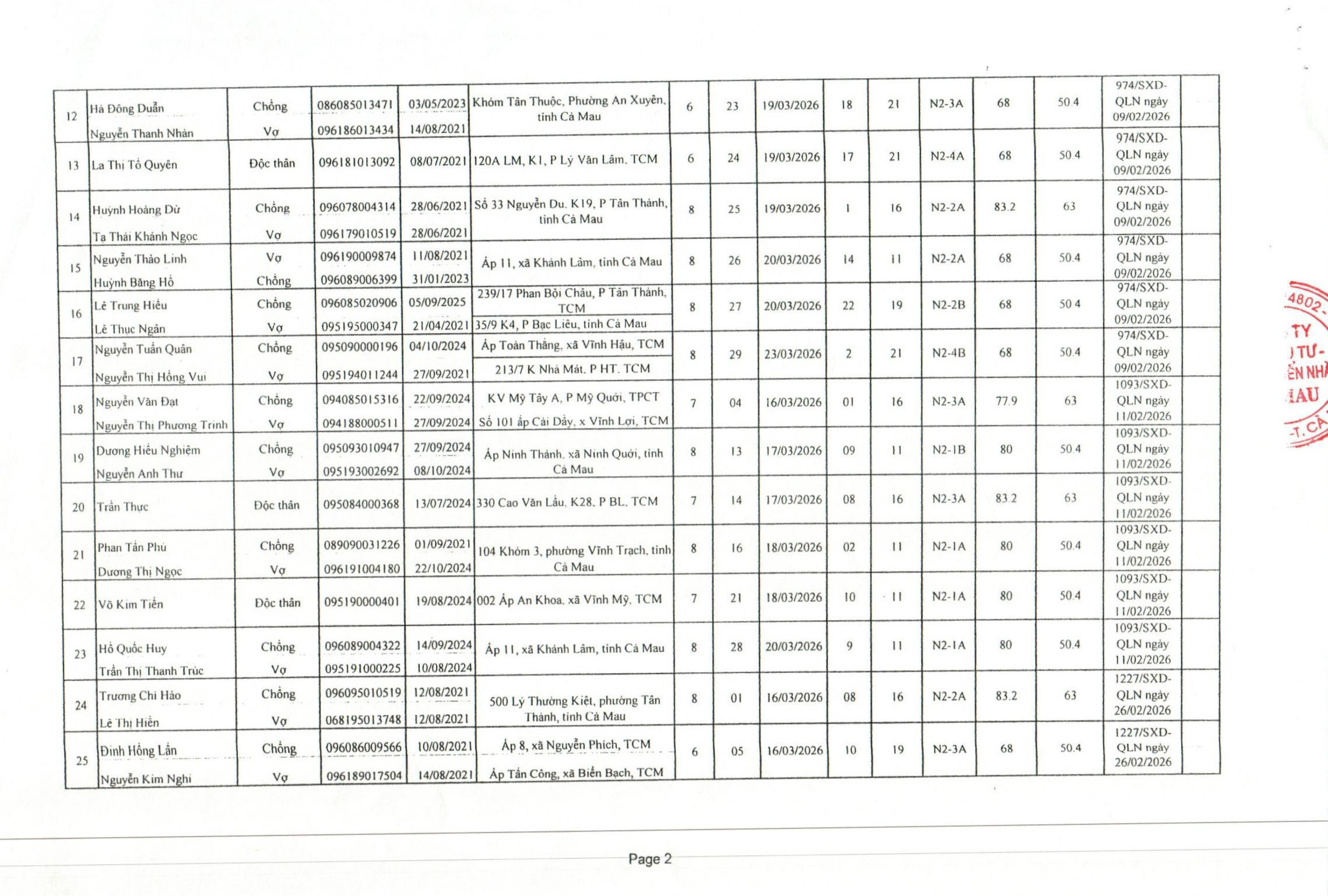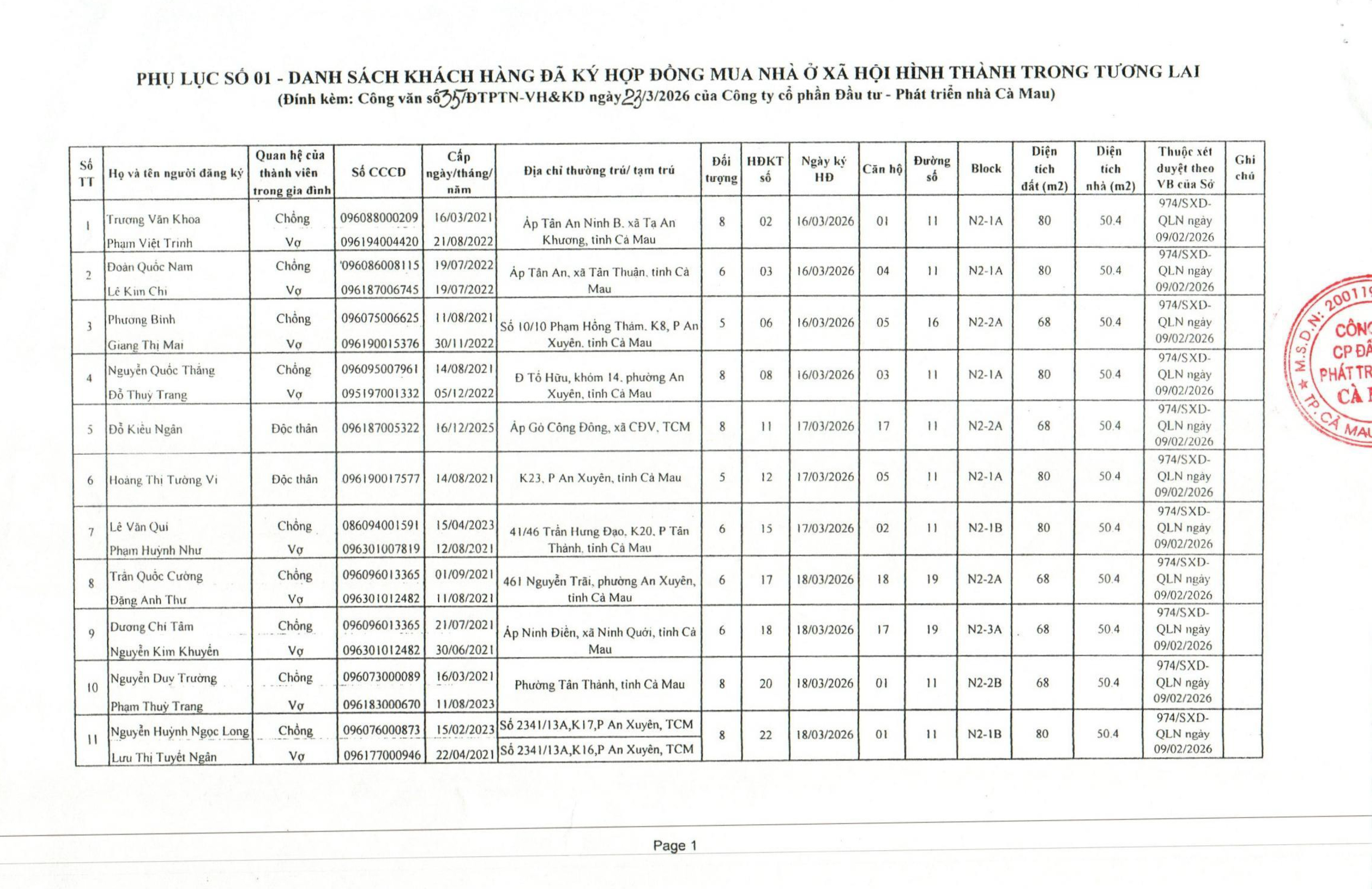 Thực hiện theo nội dung Công văn số 35/ĐTPTN-VHKD ngày 23 tháng 3 năm 2026 của Công ty Cổ phần Đầu tư - Phát triển nhà Cà Mau gửi Sở Xây Dựng tỉnh Cà Mau về việc khách hàng đã ký hợp đồng mua Nhà ở xã hội phường Tân Xuyên ( nay là phường An Xuyên) tỉnh Cả mau. Công ty Cổ phần Đầu tư - Phát triển nhà Cà Mau xin đăng tải danh sách khách hàng sau đây :